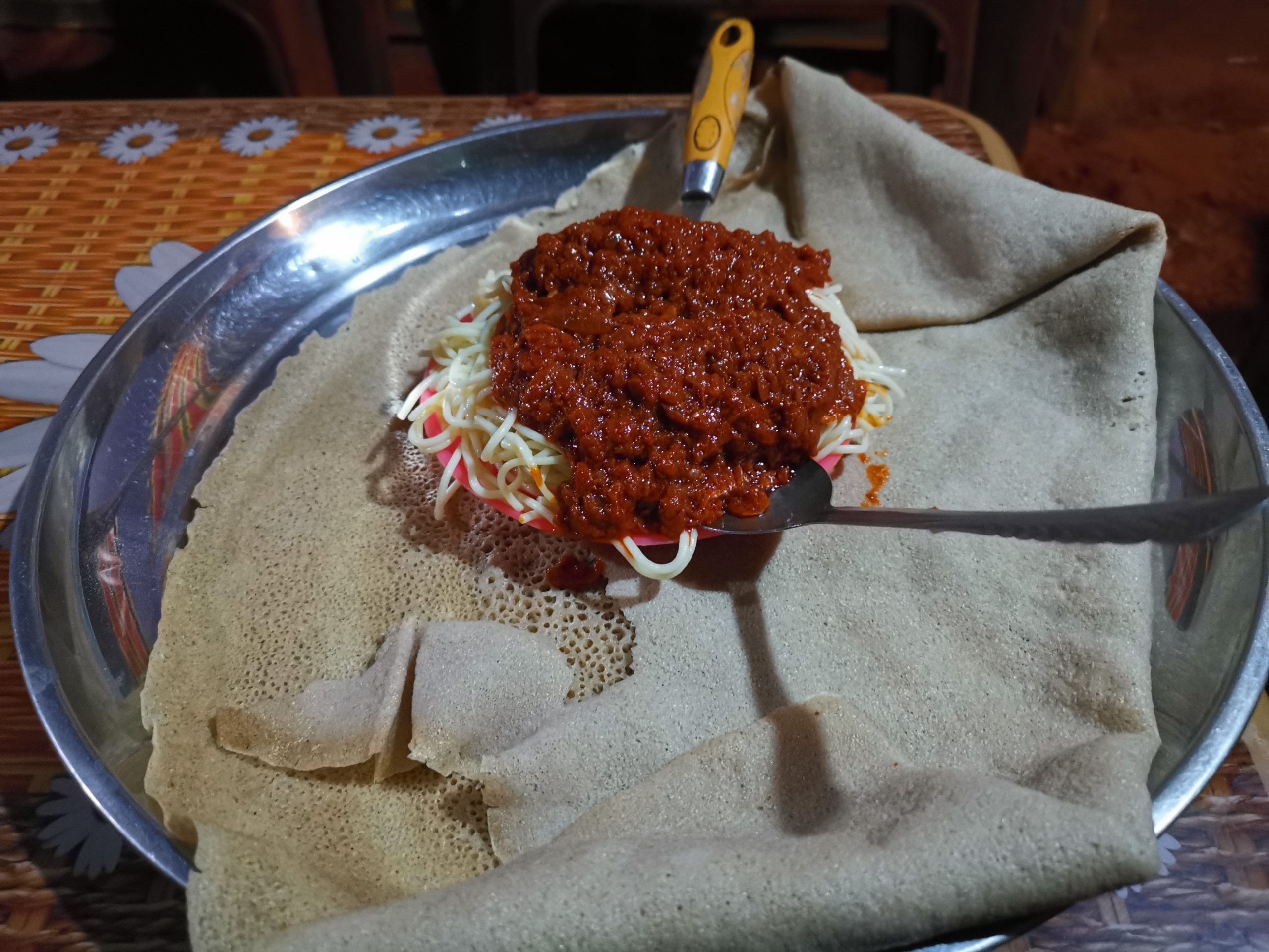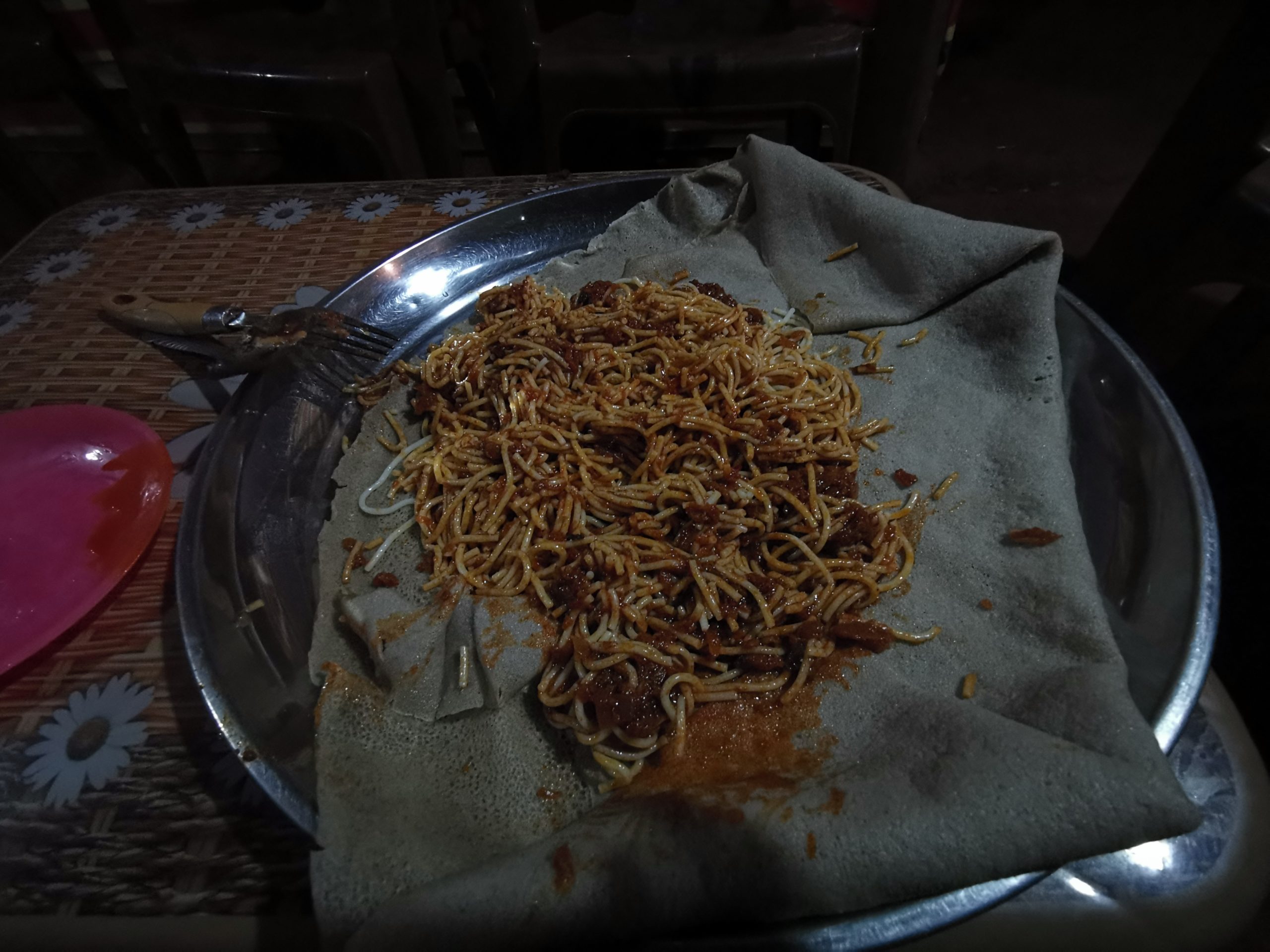 夕食はインジェラとシロと呼ばれるミートソースパスタを食べた。値段は250円ほど。頼んではいないがご厚意で店員さんが、パスタを細かくズタズタにして混ぜてくれた。