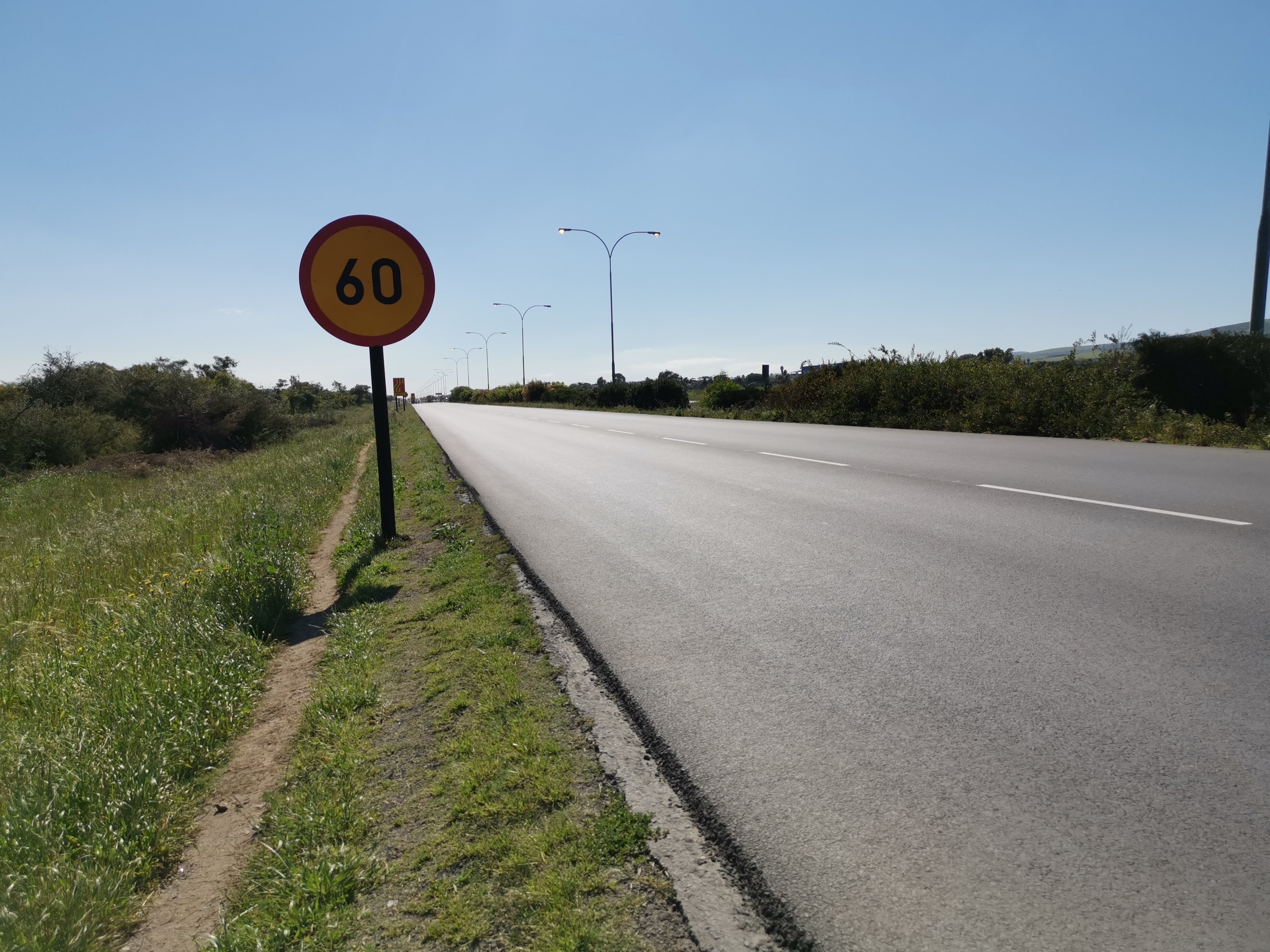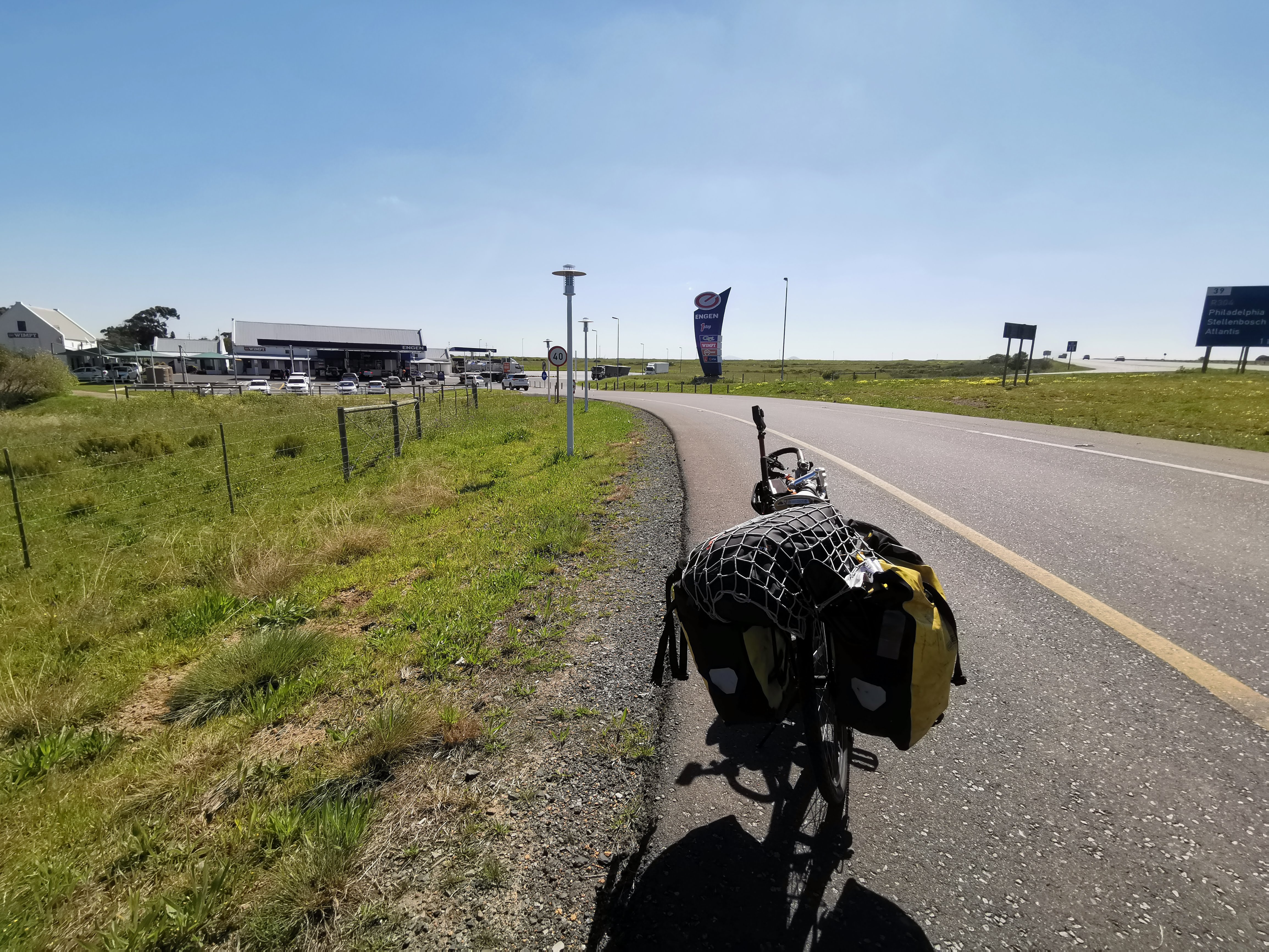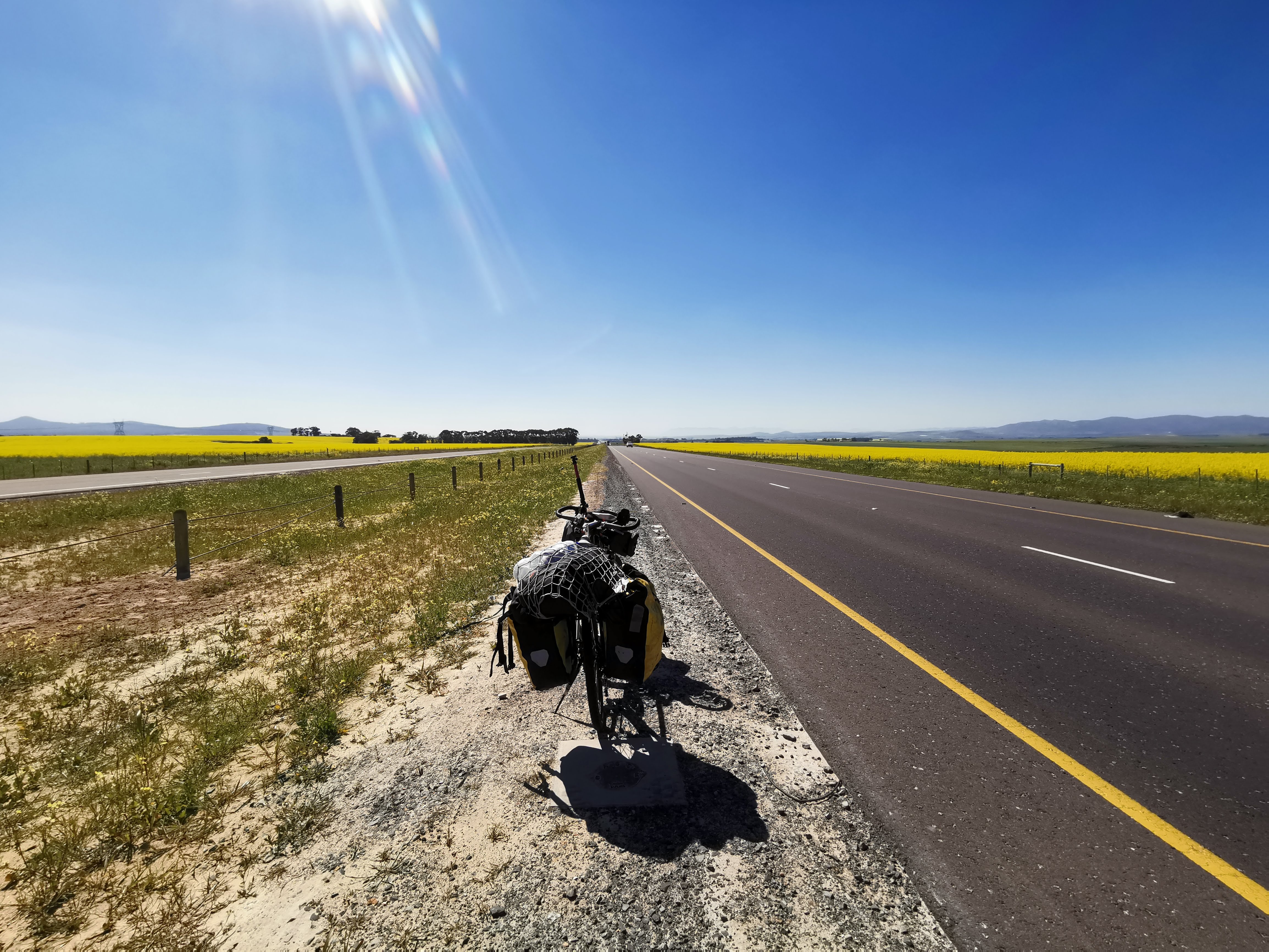 ナミビアに続く主要道路7号線は最初こそ路肩が狭くて自転車で走るのが大変だったが、北上していくにつれて路肩が広くなってきたので走りやすくなった。そして何よりも良かったのが周りの景色が綺麗だった。上の写真の黄色に映ってる部分は菜の花で、この景色がかなりの時間続いた。大自然を見渡すだけで気分がウキウキしていた。どことなく旅のスタート地だったアメリカのような景色。