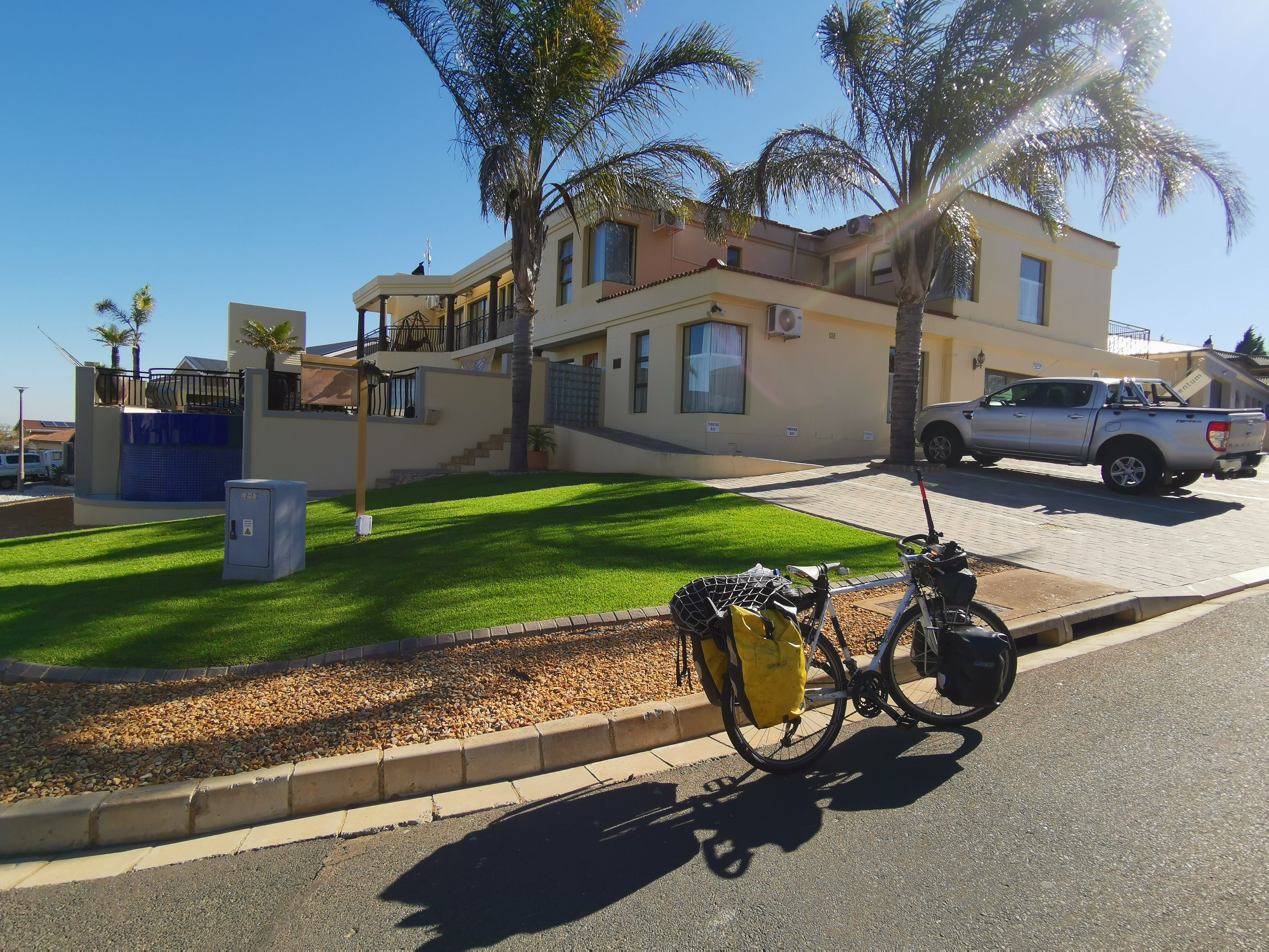 出発の朝。宿のオーナー様に見送られて出発した。今日から南アフリカからナミビアへ向かって走り始める。