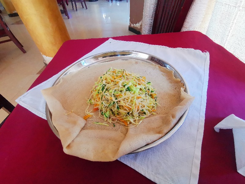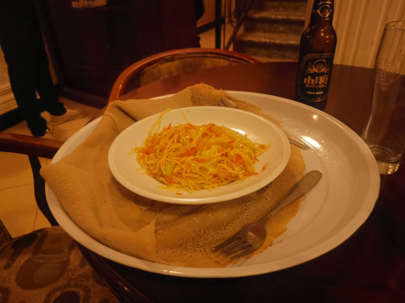 昼食は食べない事が多いのだが、ちょうどお昼の時間。折角なので食事した。ホテルの1階にあるレストランで野菜パスタとインジェラを食べた。昨日も食べたのだが、焼きそばに似ていて食べやすい。酸っぱいインジェラと合っているような気もする。
