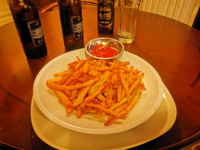 夕食は野菜パスタが付いたインジェラとポテトフライを食べた。値段300円ほど。美味しかった。