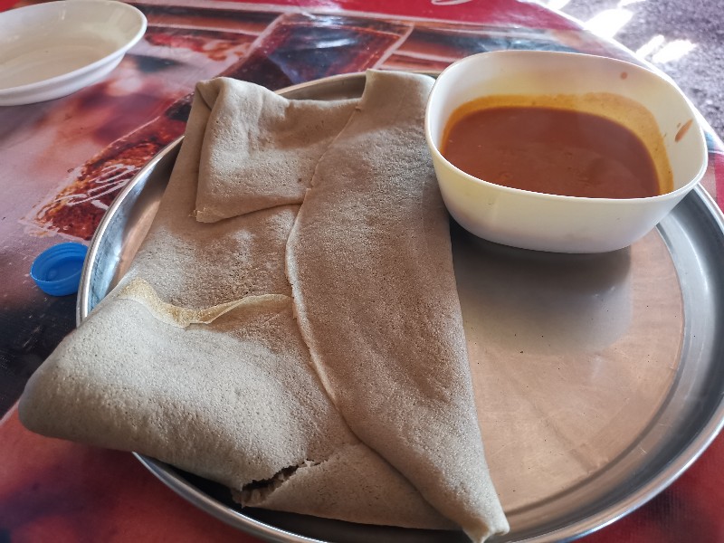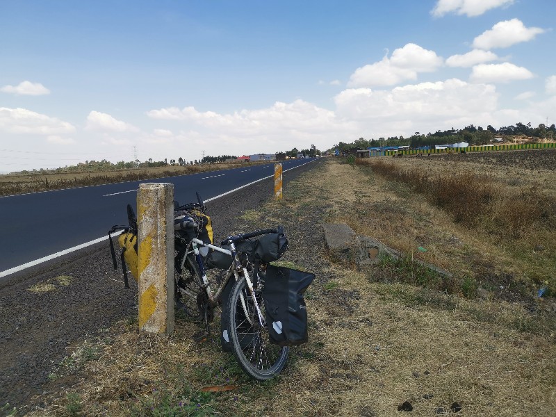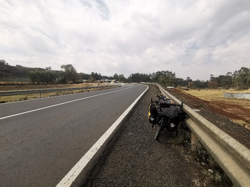 朝食はインジェラ(テフで出来た酸っぱい雑巾)とシロ(豆を煮たソース)。食べ終わってから66km先にあるデブレマルコス(地図)へと走り出した。