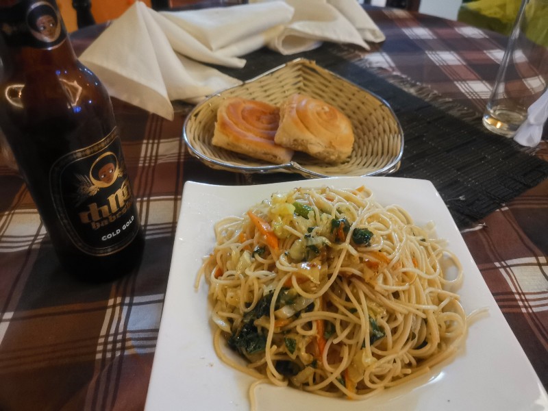 シャワーを浴びて早めに食事をとった。にんじん・キャベツ・インゲンの入った野菜パスタとパン。