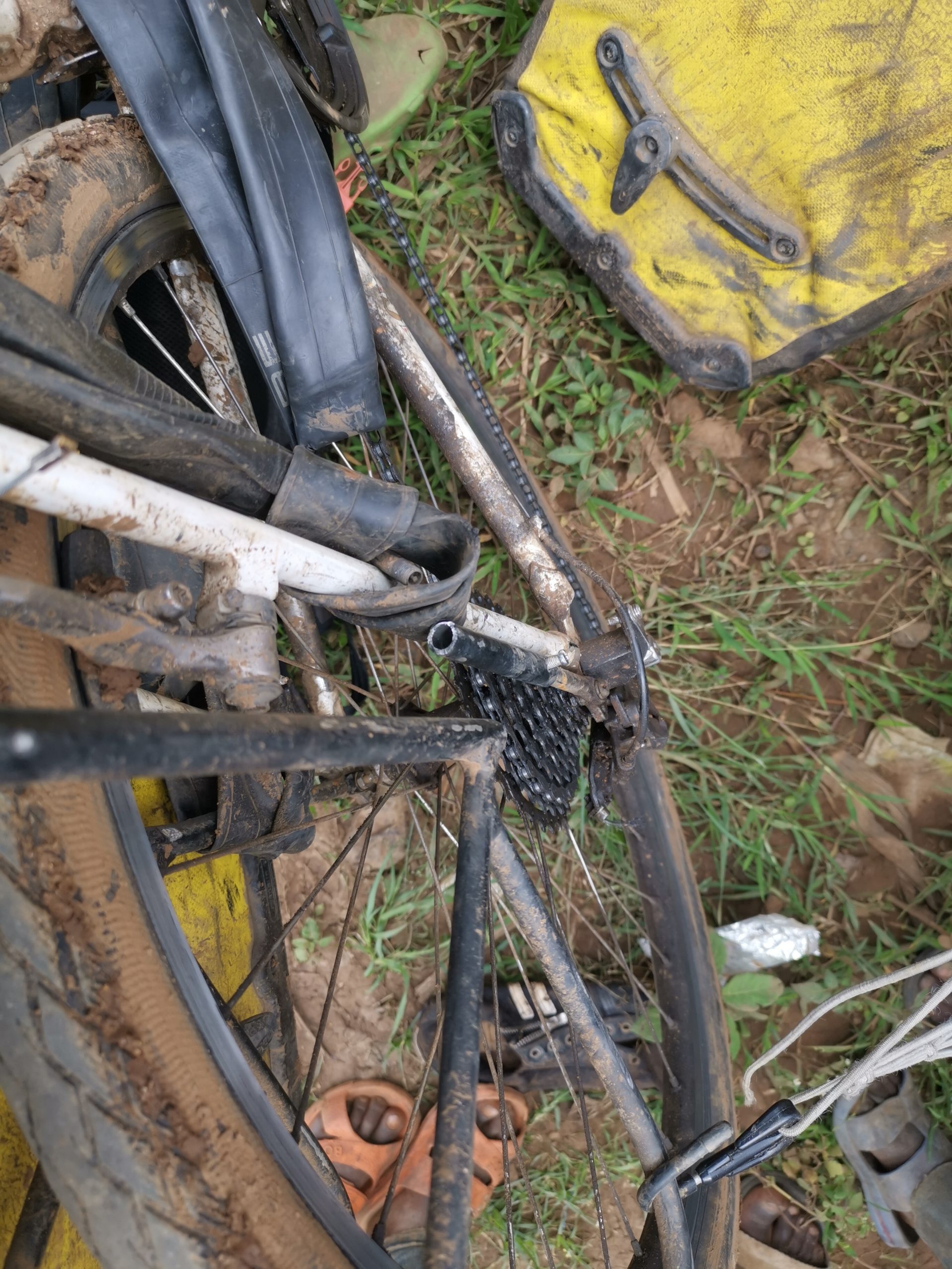 自転車から荷物を全部降ろして、折れた箇所を重点に8個くらいチューブをグルグルに巻いた。言葉で書くと簡単に見えるが、正常に走れるよう何度も巻き直した。直している最中には辺りの家々から出てきた若者や子供達に取り囲まれていた。万が一もあるので、盗難に気をつけて意識を鞄に向けながら、チューブを巻いた。なんとか走れるようになったが、これで1時間ほどロスした。結構必死だったので写真を撮る余裕すらなかった。