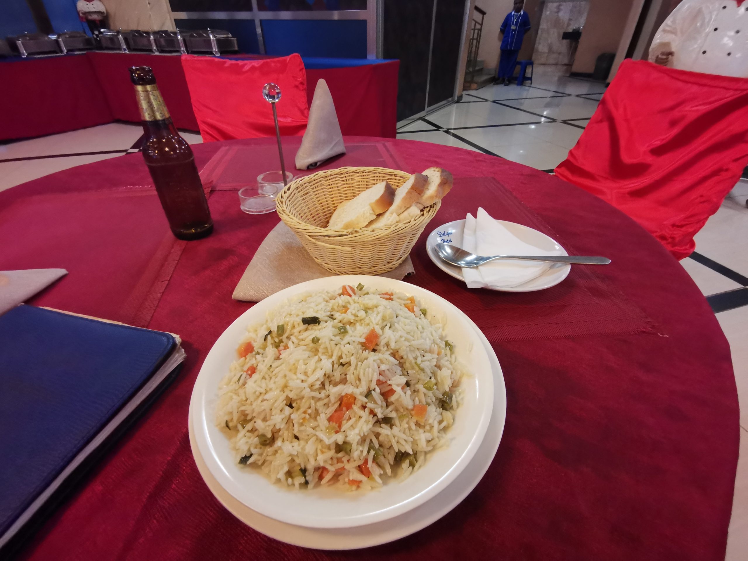 夕食はグリーンピースと人参の入ったライス、トマトベースのチキンパスタを食べた。ビール合わせて800円。美味しかった。