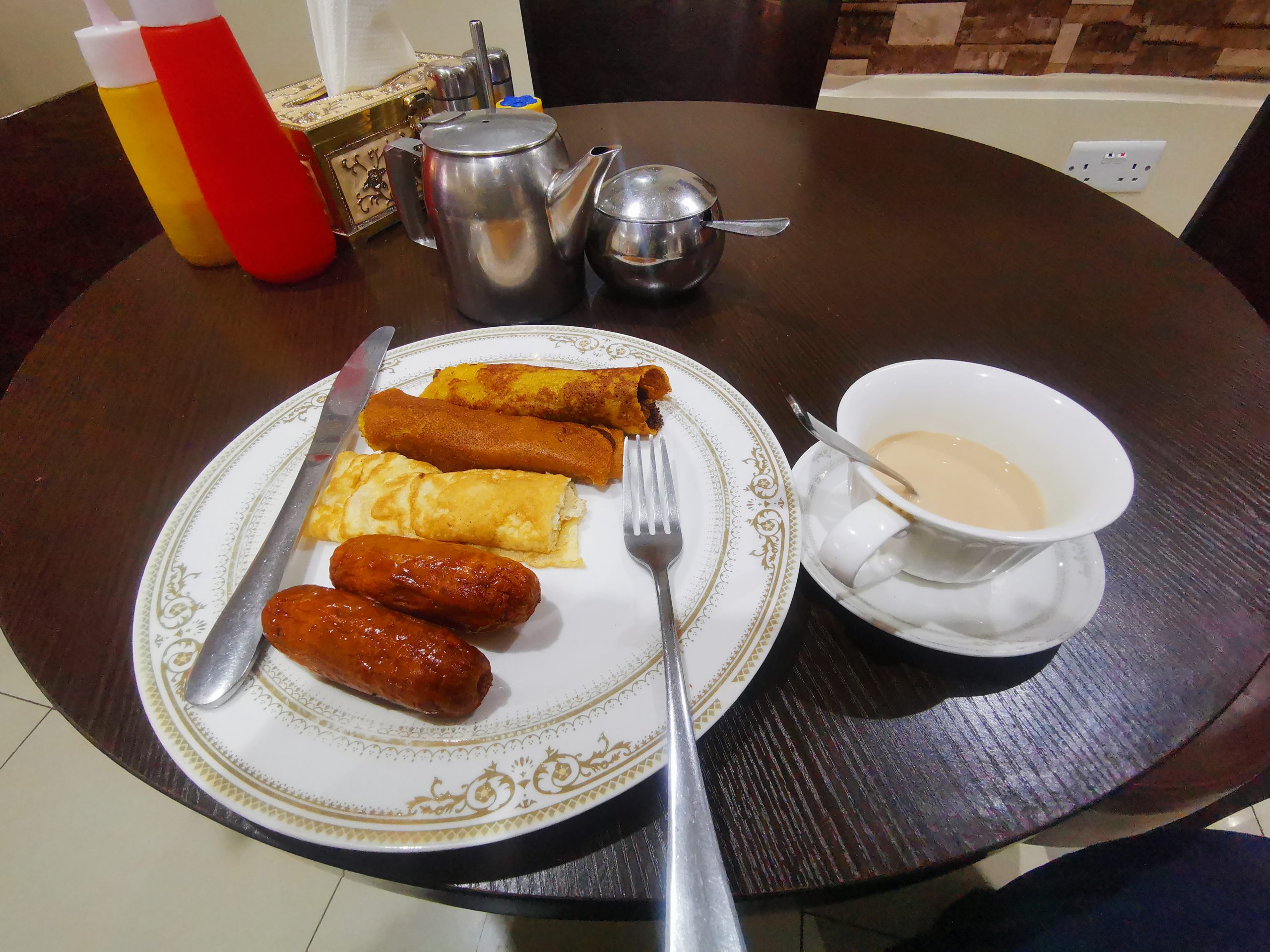 朝食はパンケーキ・玉子焼き・ウインナー・ミルクティー。夕食はチキンカレー。どちらもほぼ野菜なしです。