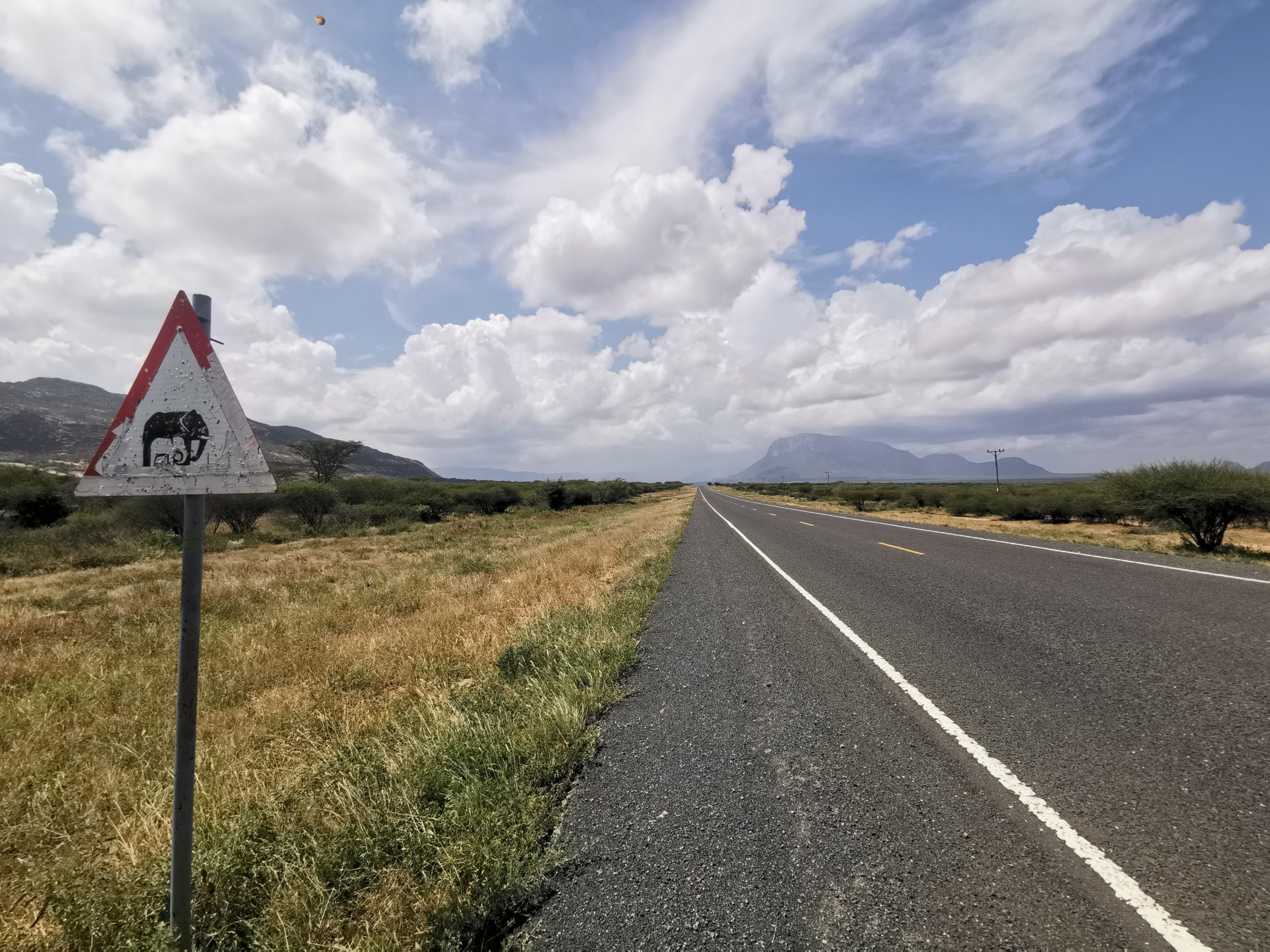 象🐘出没注意の標識。この辺りはサファリが近いので、象の他にライオン・ハイエナ・チーターなどが道路に出てくる事も。