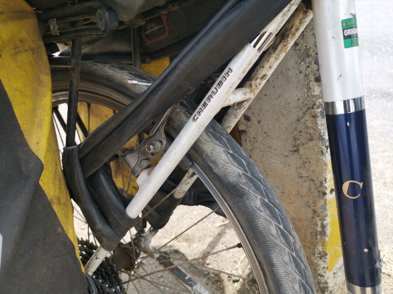 しばらくするとブレーキが効かなくなった。ブレーキシューがすり減っているようで持っていた予備と交換したのだが、摩擦熱でホイールが高温になっていて危険な状態だった。バーストする可能性もあるので、靴底を地面に着けてブレーキ代わりにして、景色を楽しみつつも出来る限りスピードを落とした。