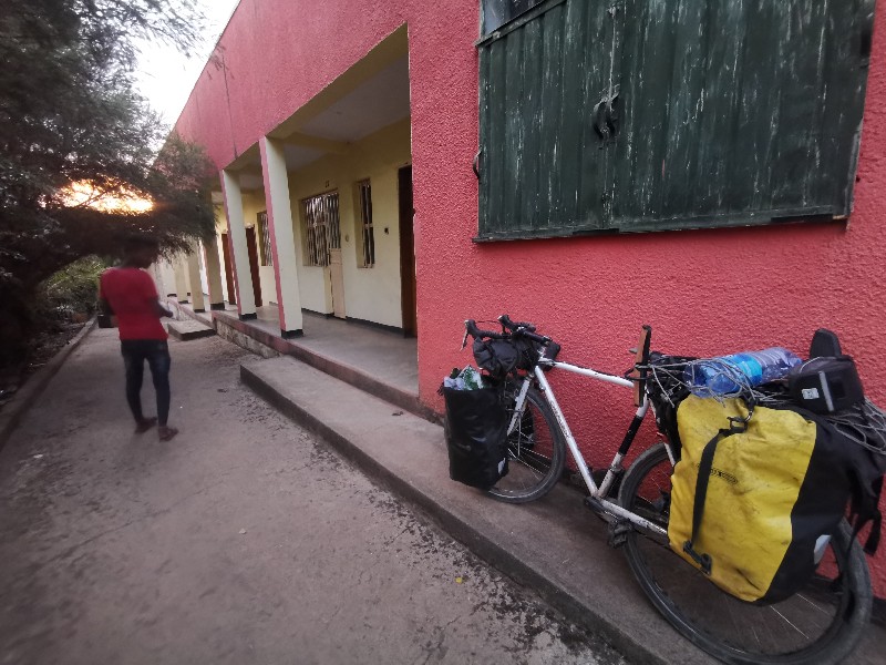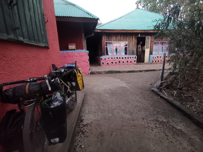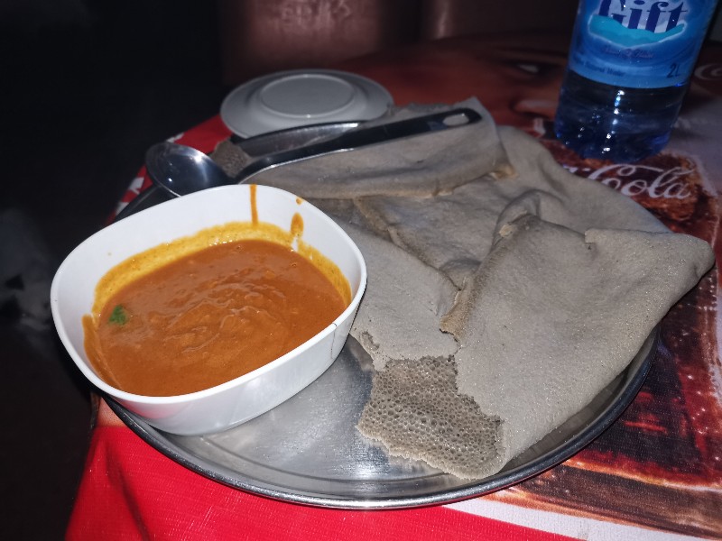 今日の宿は水も電気もない。1泊660円。MAFLAB International Hotel(地図)。虫を避けて部屋にテントを張った。夕食はインジェラ(テフで出来た酸っぱい雑巾)とシロ(豆を煮たソース)。