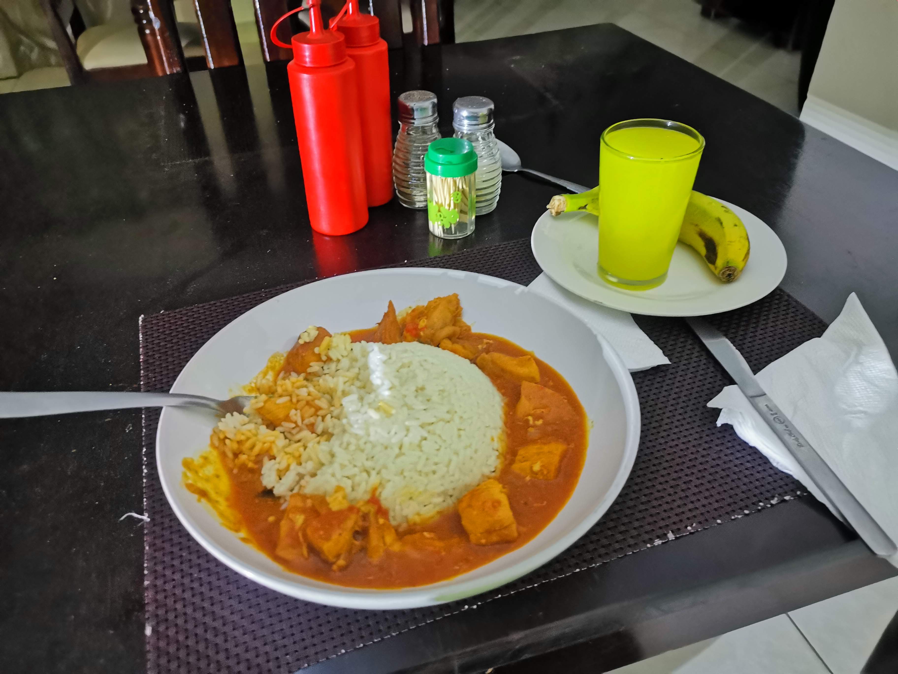 朝から何も食べていない。夕食を作ってくれる宿でチキンカレーを注文した。もうどこのお店もやっていない時間だったので助かった。バナナとマンゴージュースは従業員の方のご厚意により無料でいただいた。ありがたい。