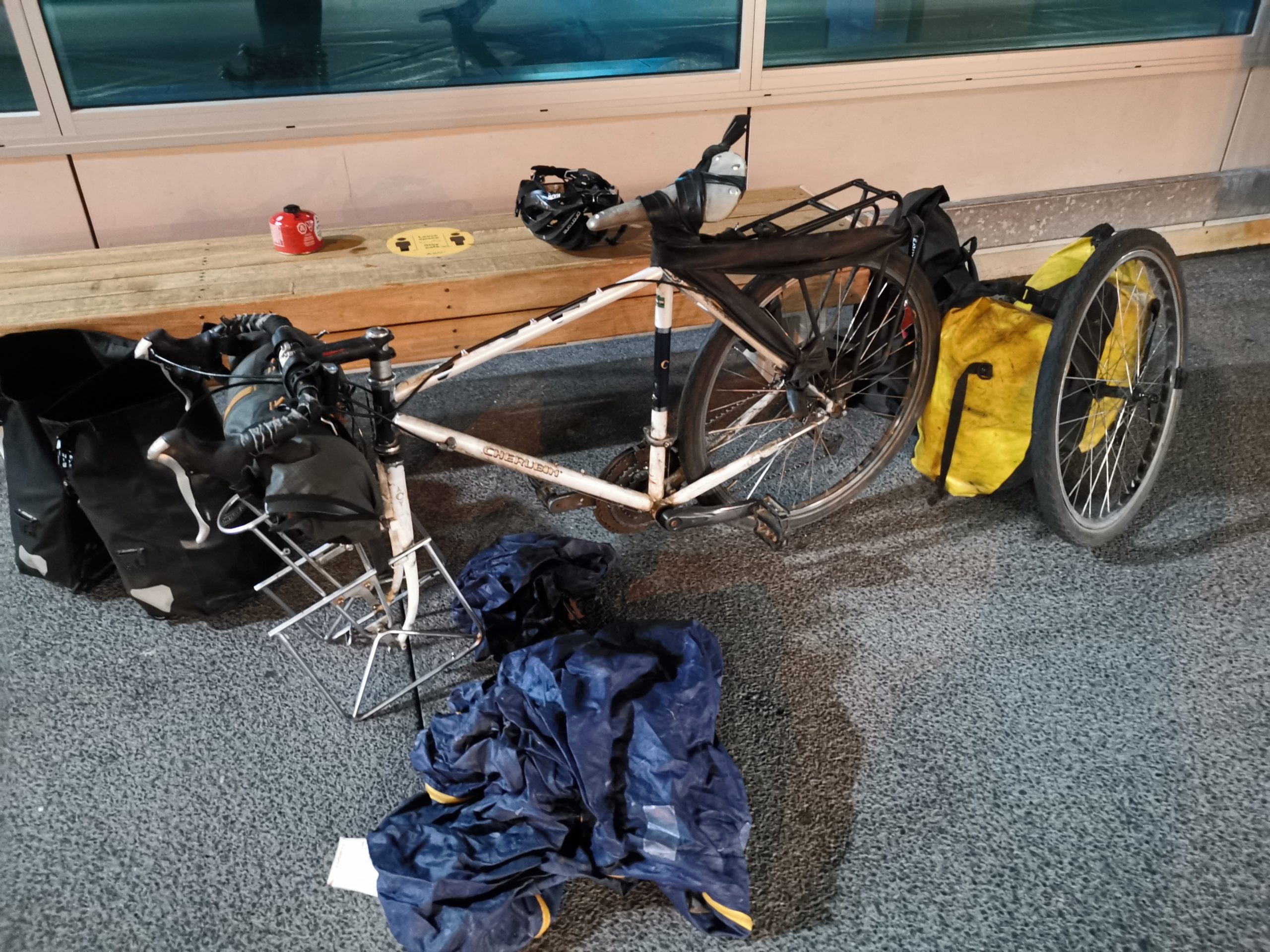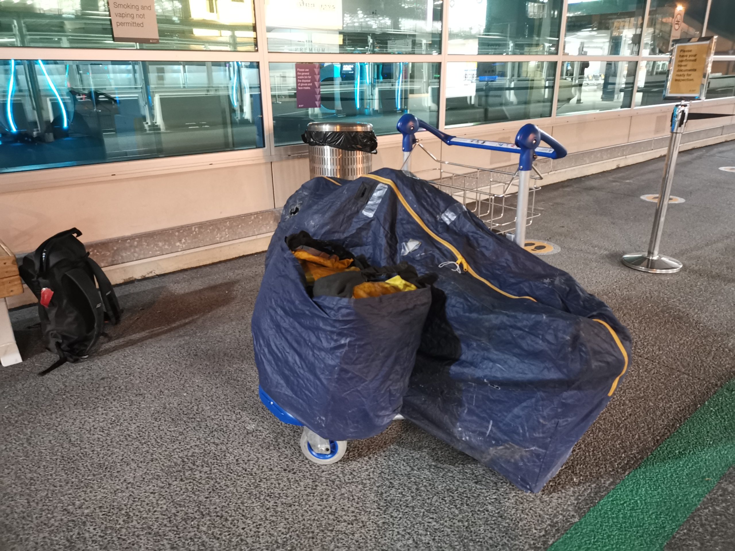 二日前に買った未使用の燃料は空港に入る際にスタッフに手渡した。若干警戒されたが問題なく空港に入場できた。中はスタッフが少なく静かだった。チェックインは無人で機械からチケットが発行された。荷物を預けるブースにはスタッフが一人。大型荷物扱いとなる自転車もスムーズに預かってもらうことができた。