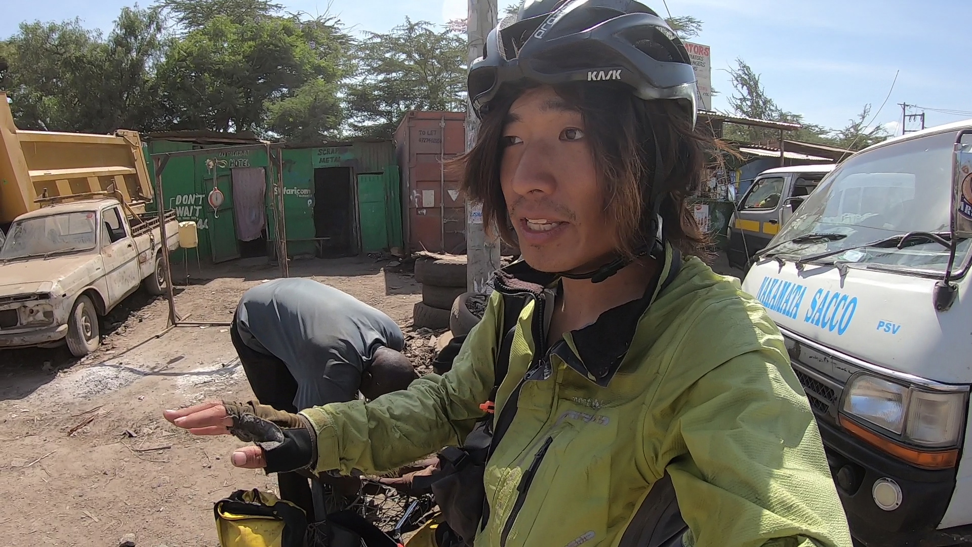 ネジを取り換えれば直る簡単な故障。新しいネジに取り換えようとしているところ、なんと近くにあった車の修理屋さんが僕の代わりに自転車を修理してくれた。ありがたい。