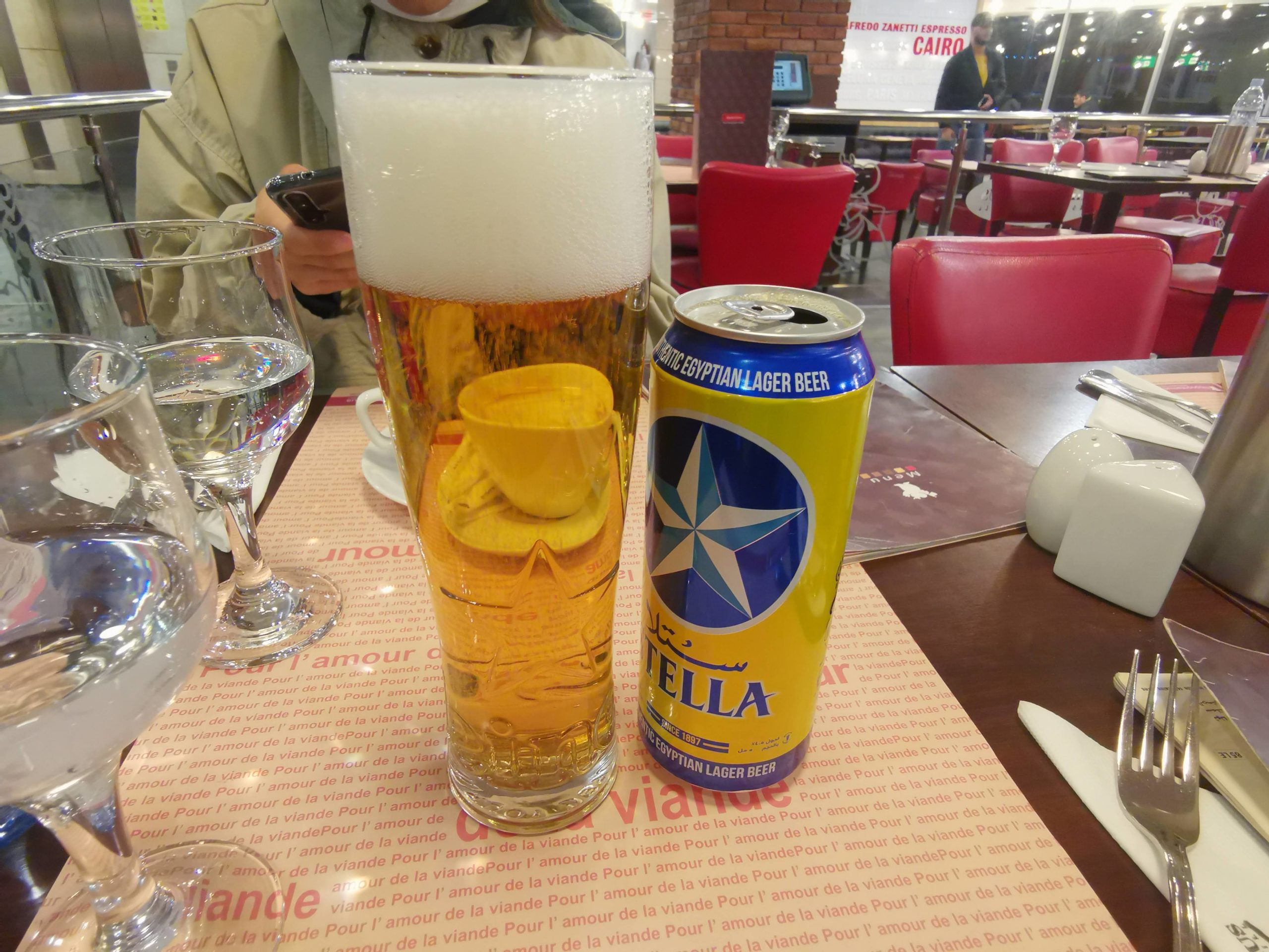 下の写真はSTELLAというエジプトのビール。エジプトはイスラム教の国なのでお酒が置いてない店が多かったのですが、カイロ空港ではお酒が飲めて大満足でした。