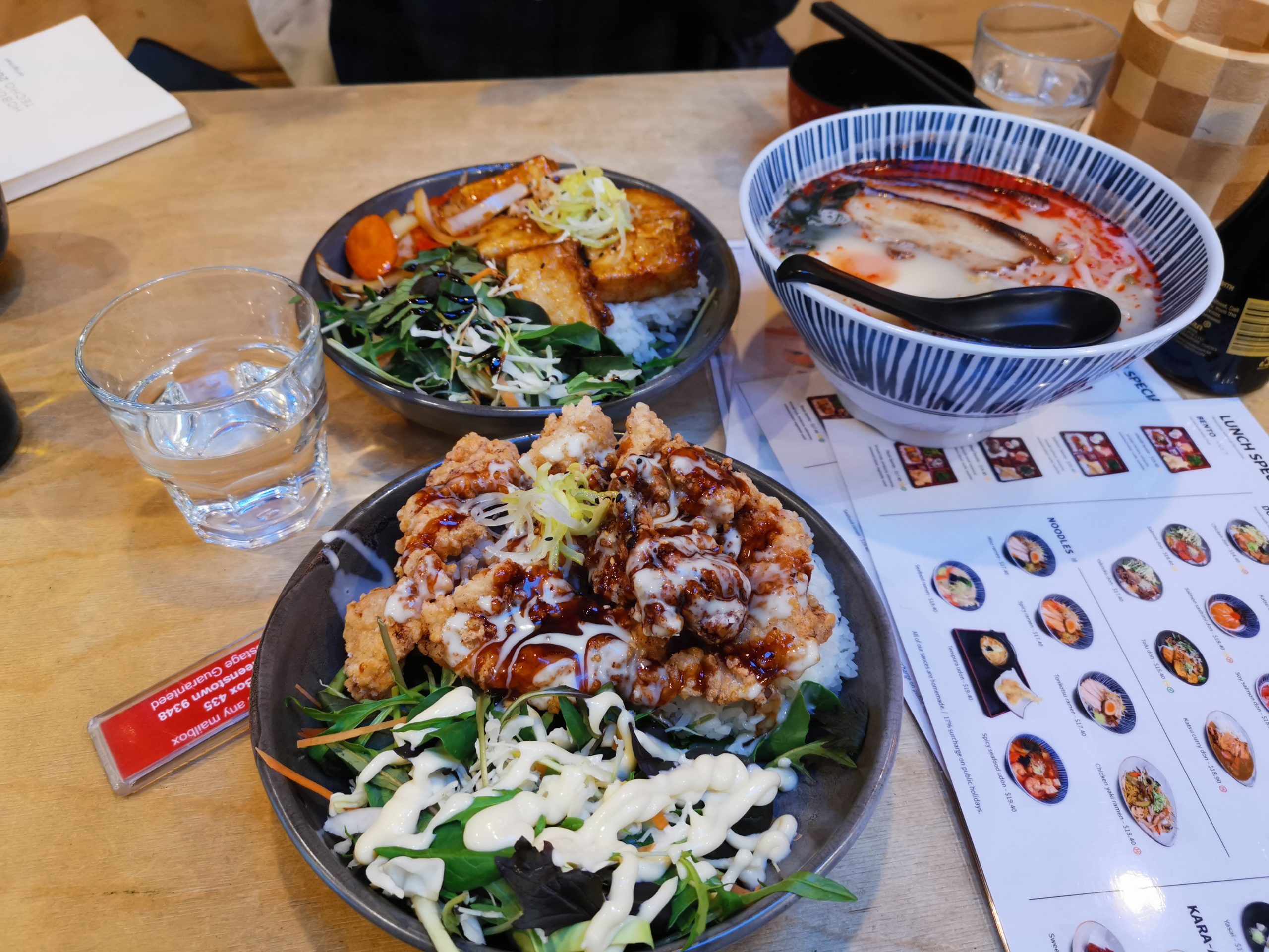 夕食は和食店Hikari Sushi Bar(地図)へ。唐揚げ丼と豆腐丼と辛めのラーメンを注文した。ボリューム満点だった。