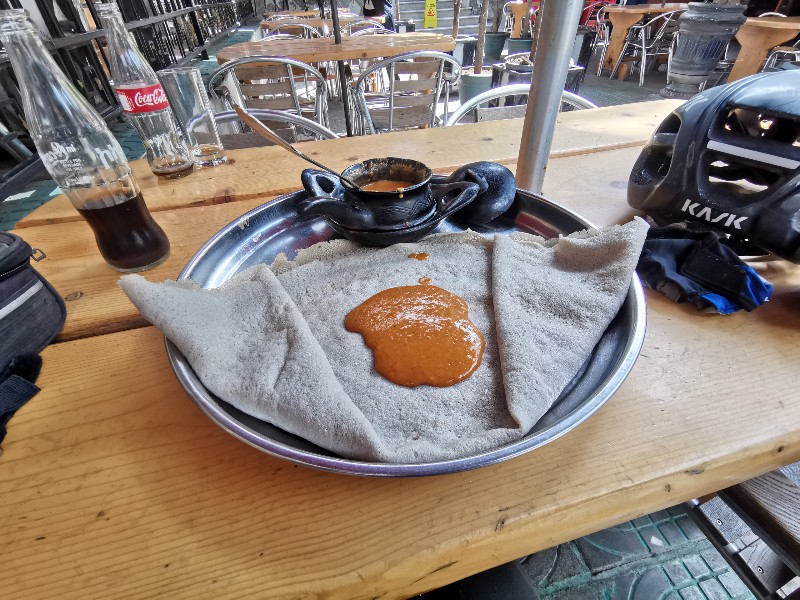 ついでにインジェラ(酸っぱい雑巾)とシロ(豆と唐辛子のソース)を食べた。3時間ほどでブログを書き終わると、再び走り出した。
