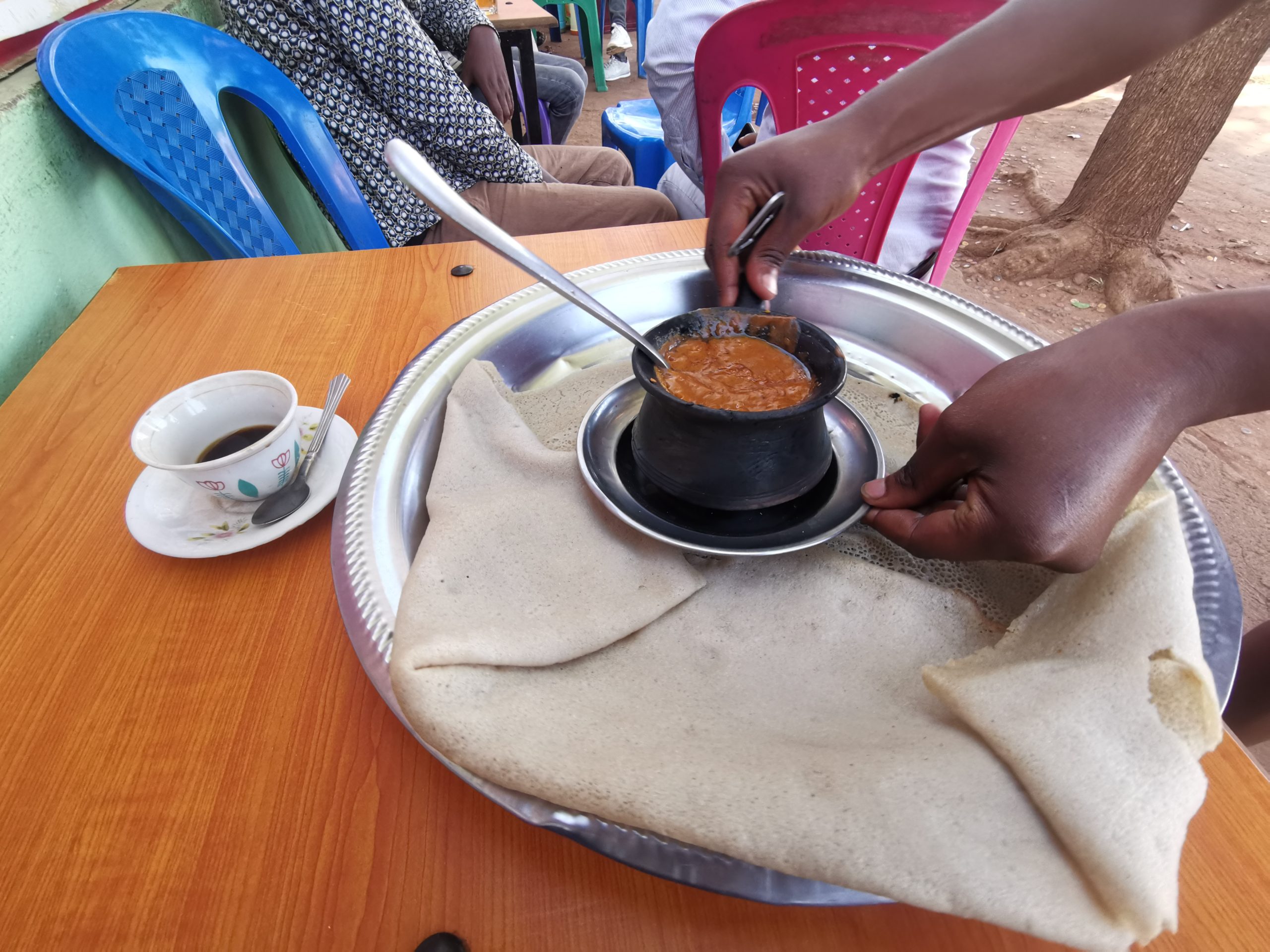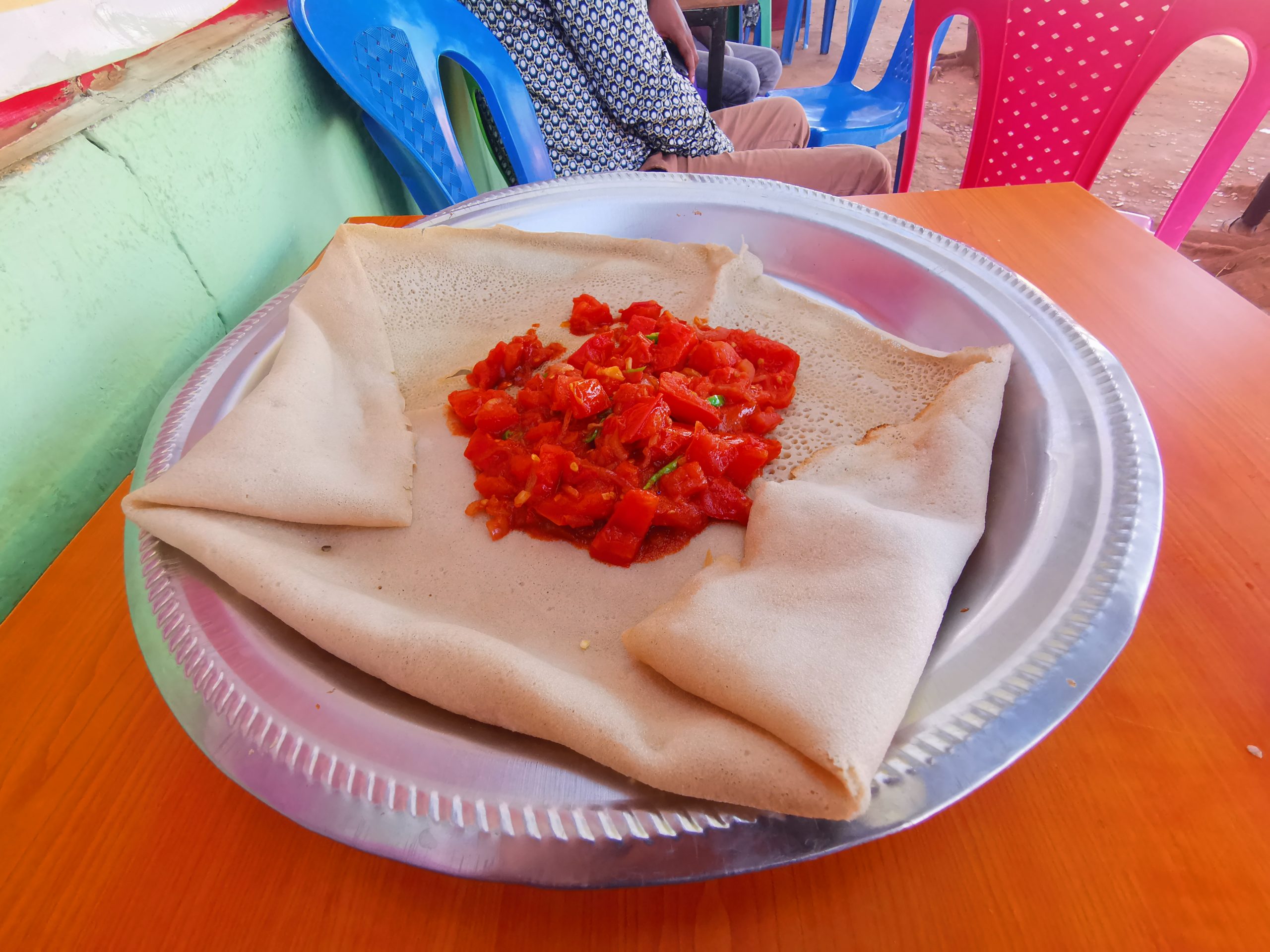 煮た豆のソースとインジェラ、焼いたトマトとインジェラを食べた。値段は350円。夕食も兼ねていたのでお腹一杯に食べた。美味しかった。酸っぱさにも慣れてきた。