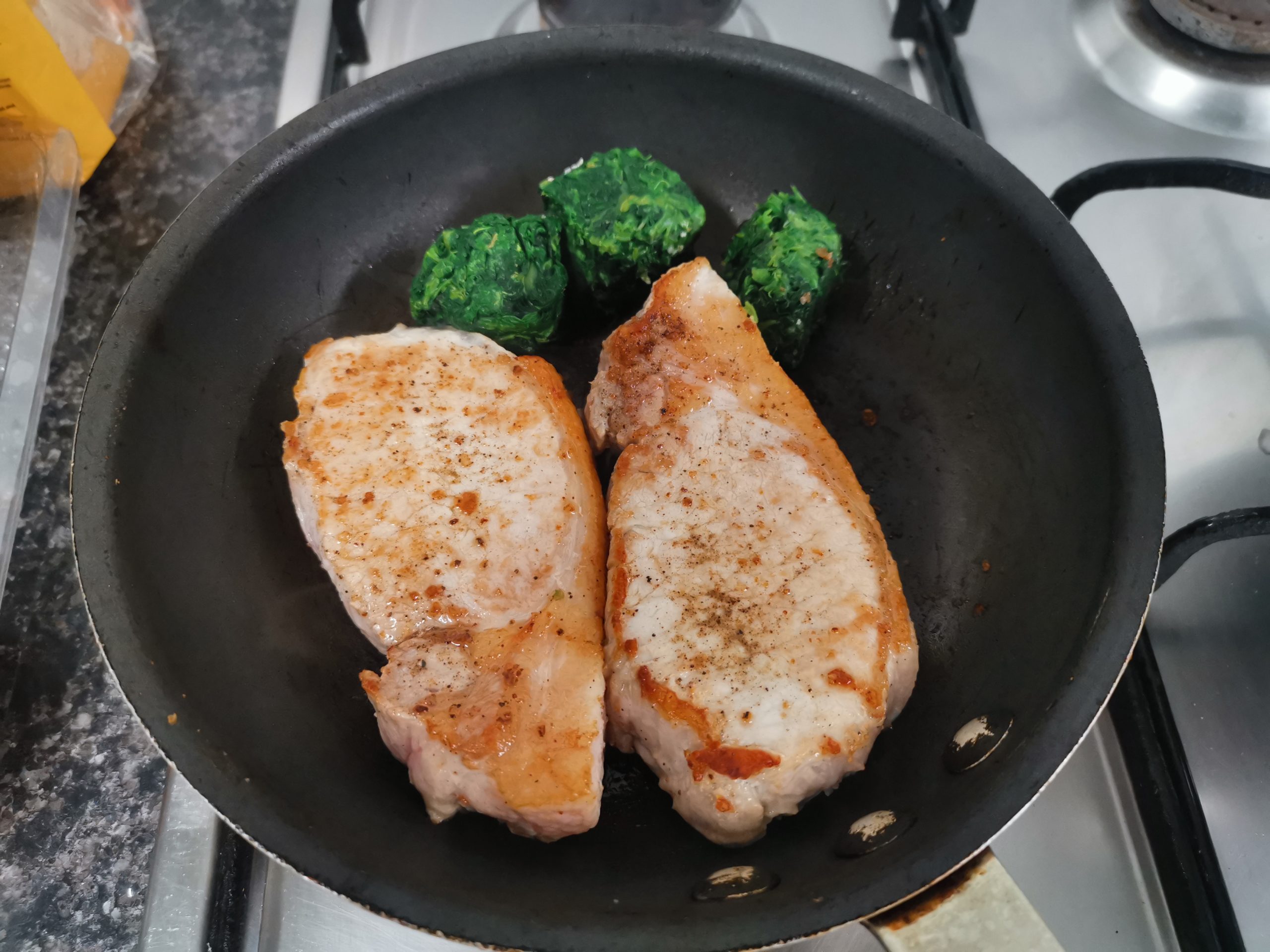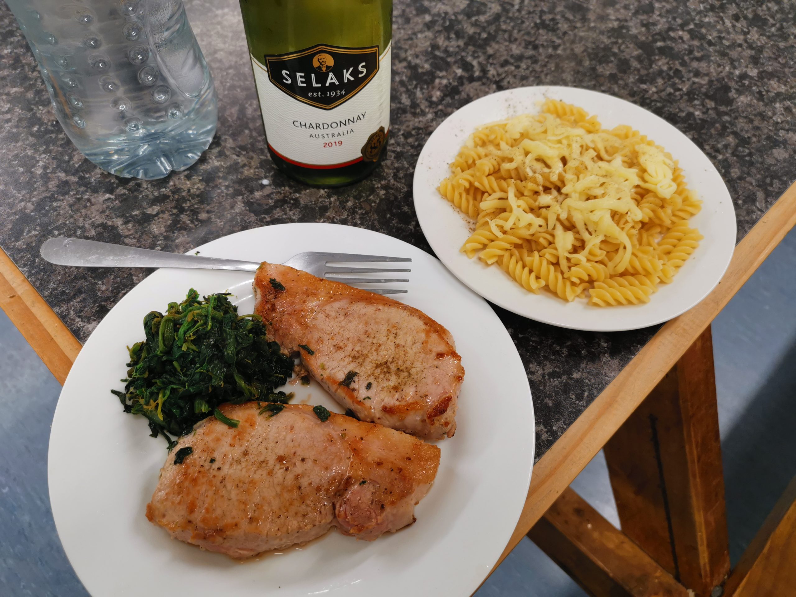 夕食は豚肉ステーキ、ほうれん草、パスタ。味付けはチーズと塩コショウ。美味しかったです!!!