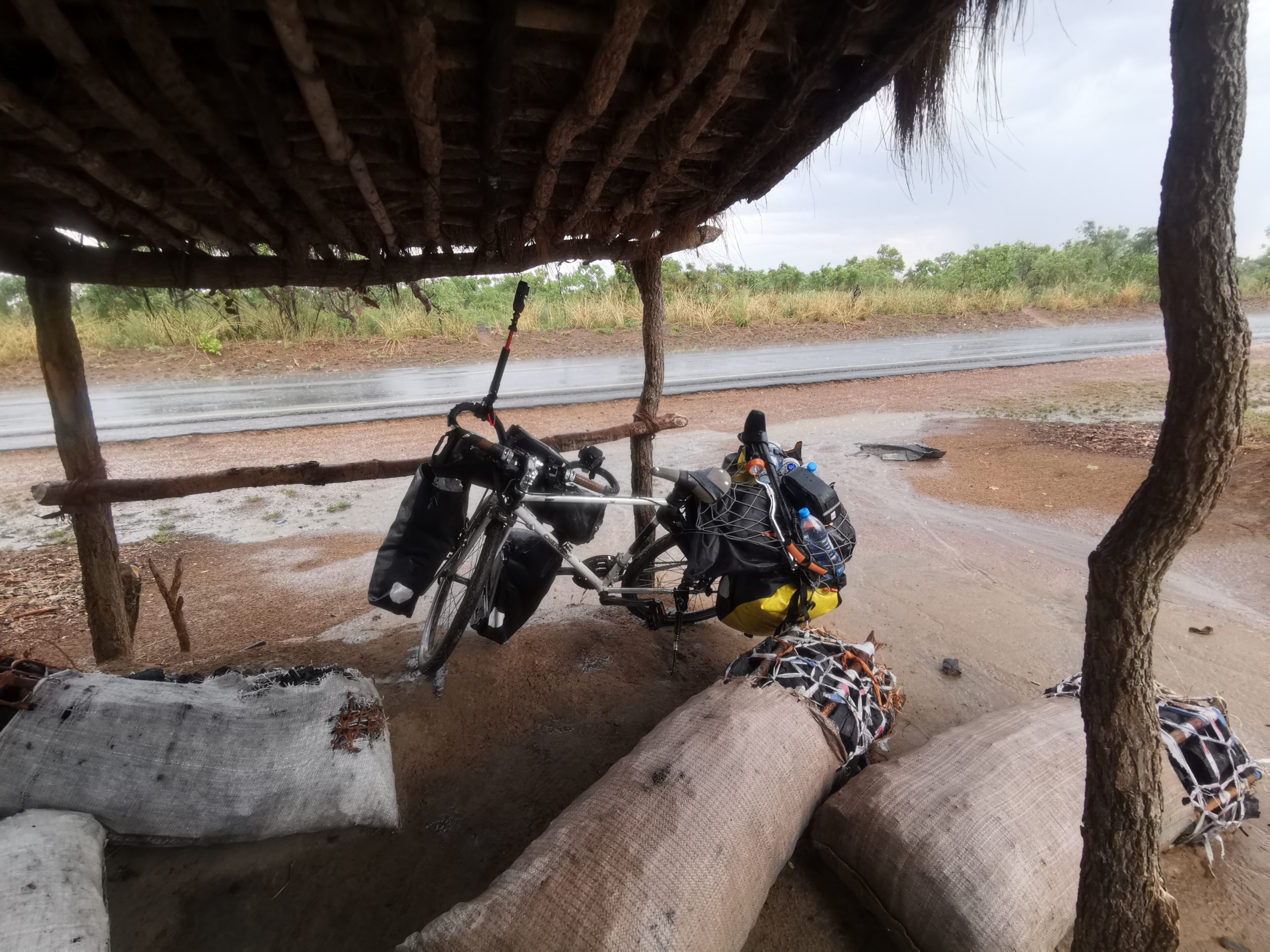 走り始めた矢先だった。先ほどよりも強い大雨と雷に襲われた。急いで雨をしのげそうな所を探した。しばらく雨に濡れたが道路脇に見つけた木とワラでできた屋根へと避難した。