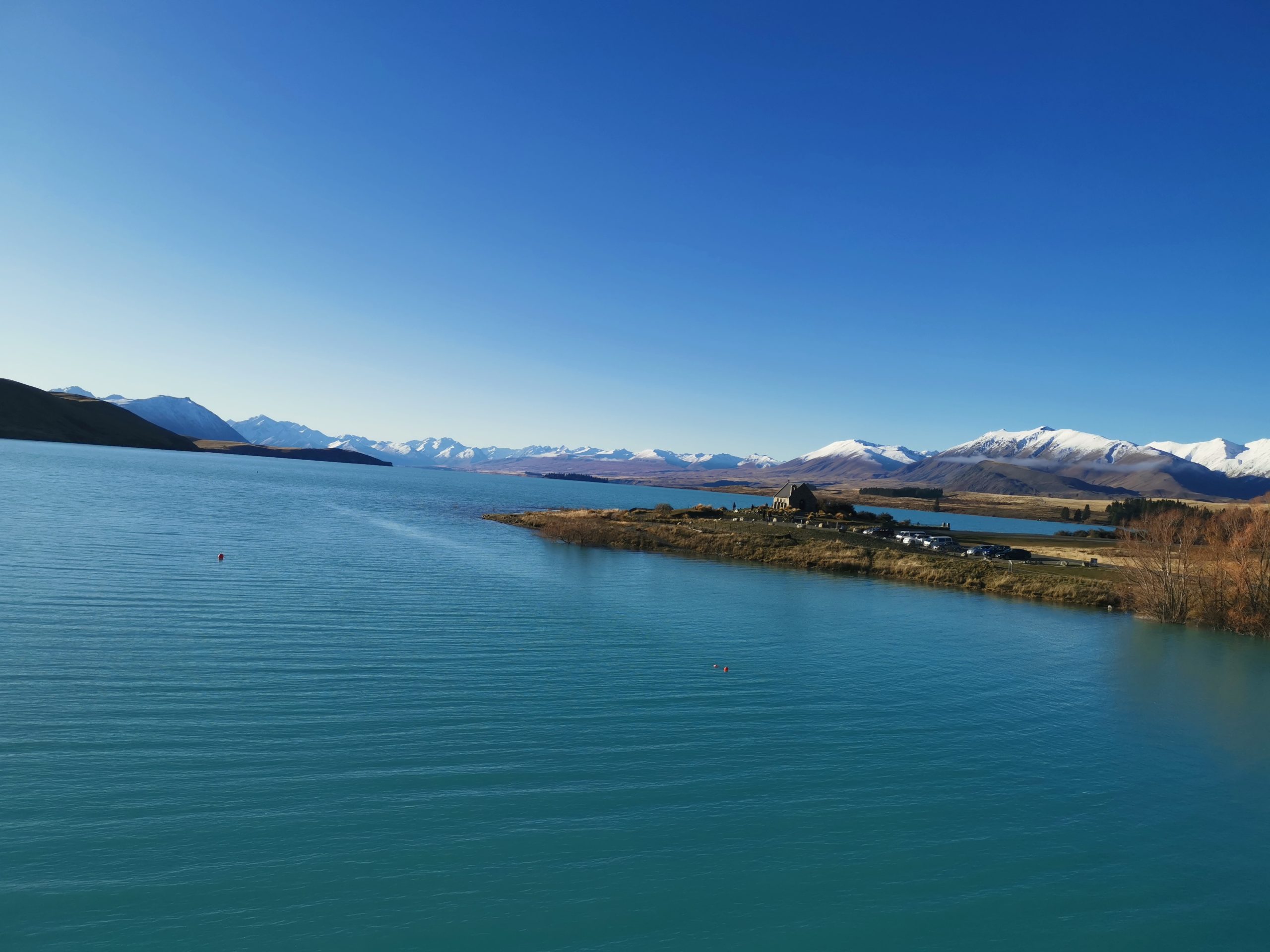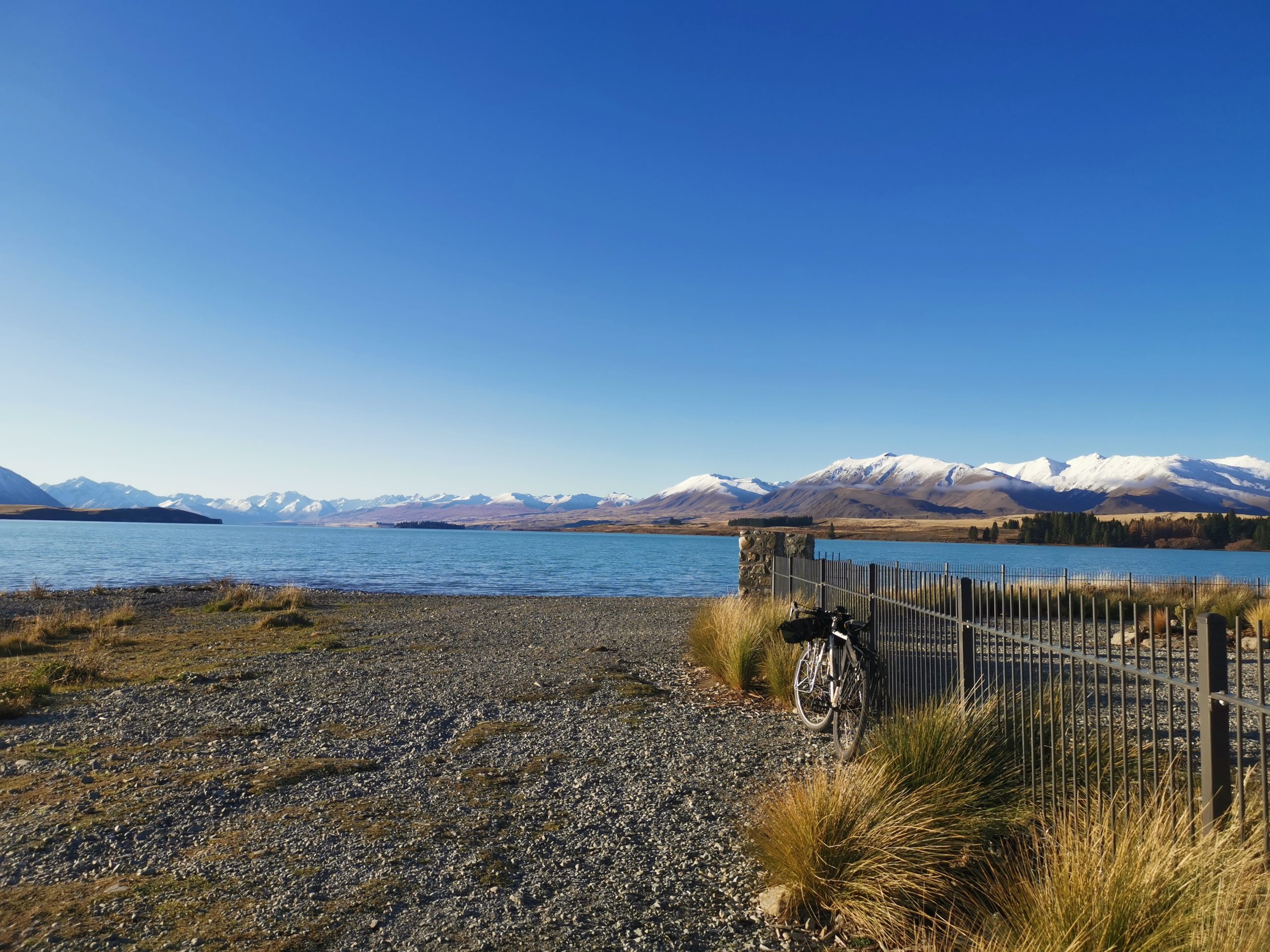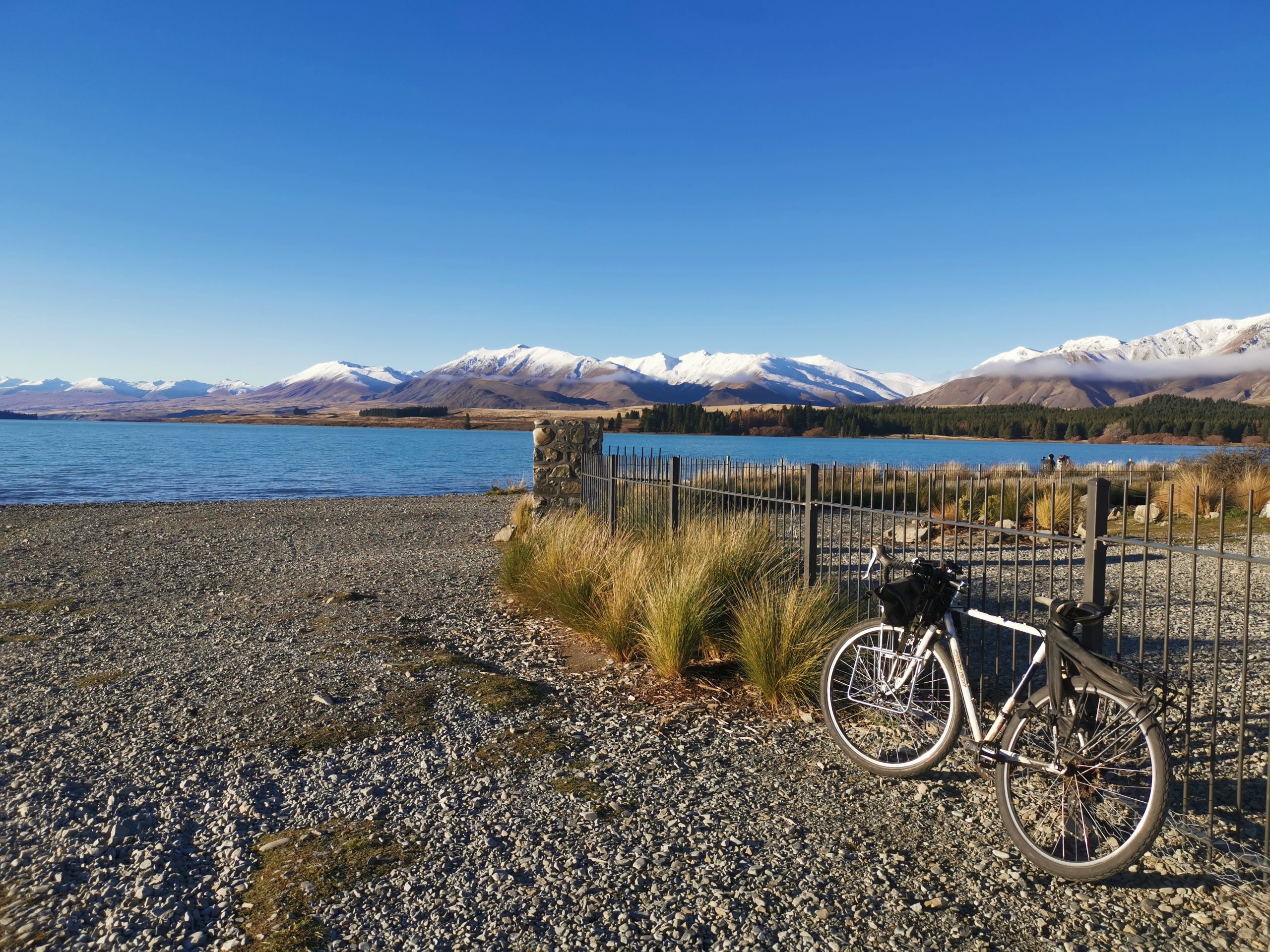 昨日の雨で濡れたテントや寝袋などを洗濯した後、急いでテカポ湖へ。雲一つない晴天。気温は3℃ほど。写真の奥の方に見える建物は善き羊飼いの教会(地図)という人気のある観光スポット。自転車でフラフラと散策してみた。