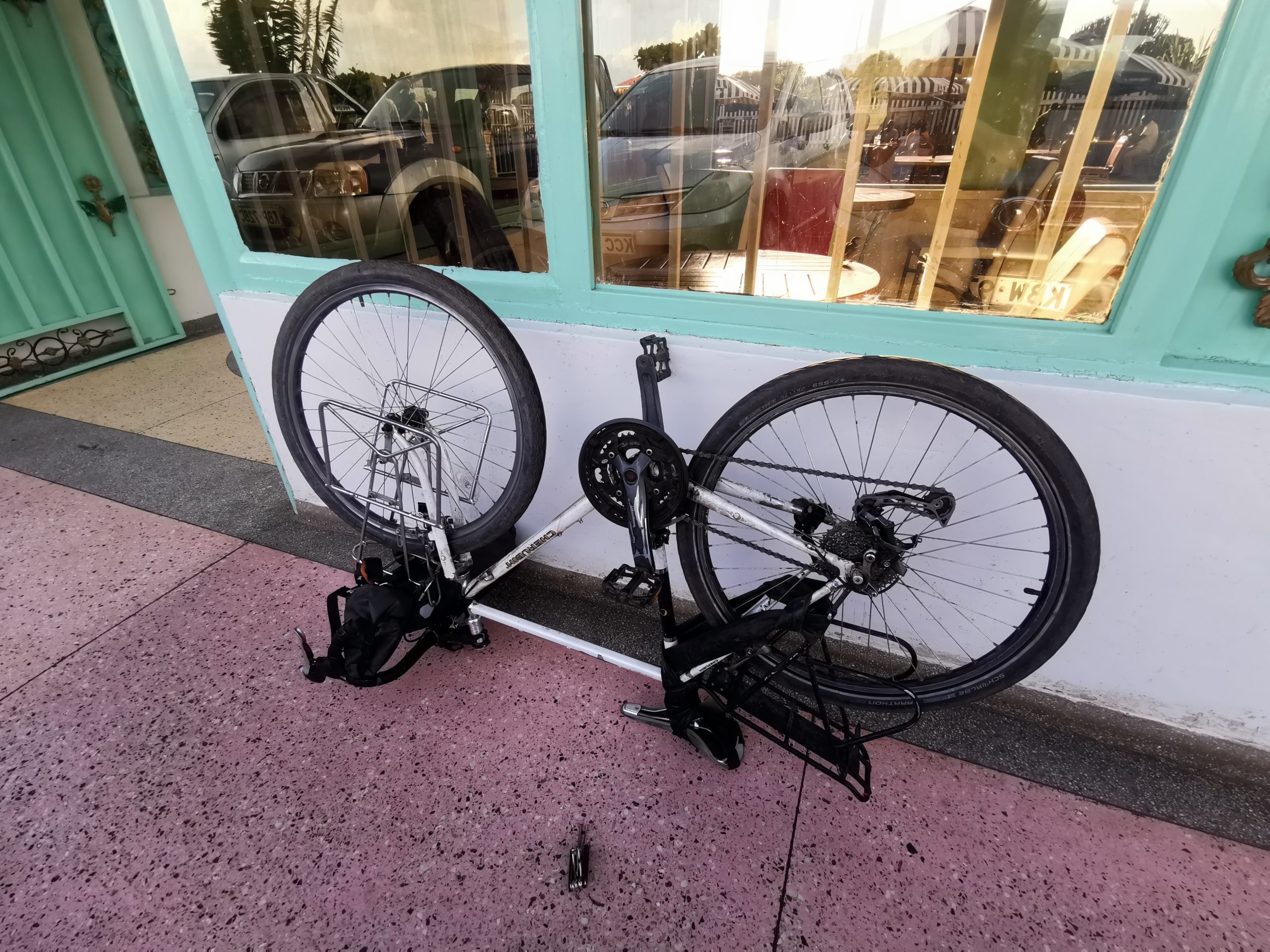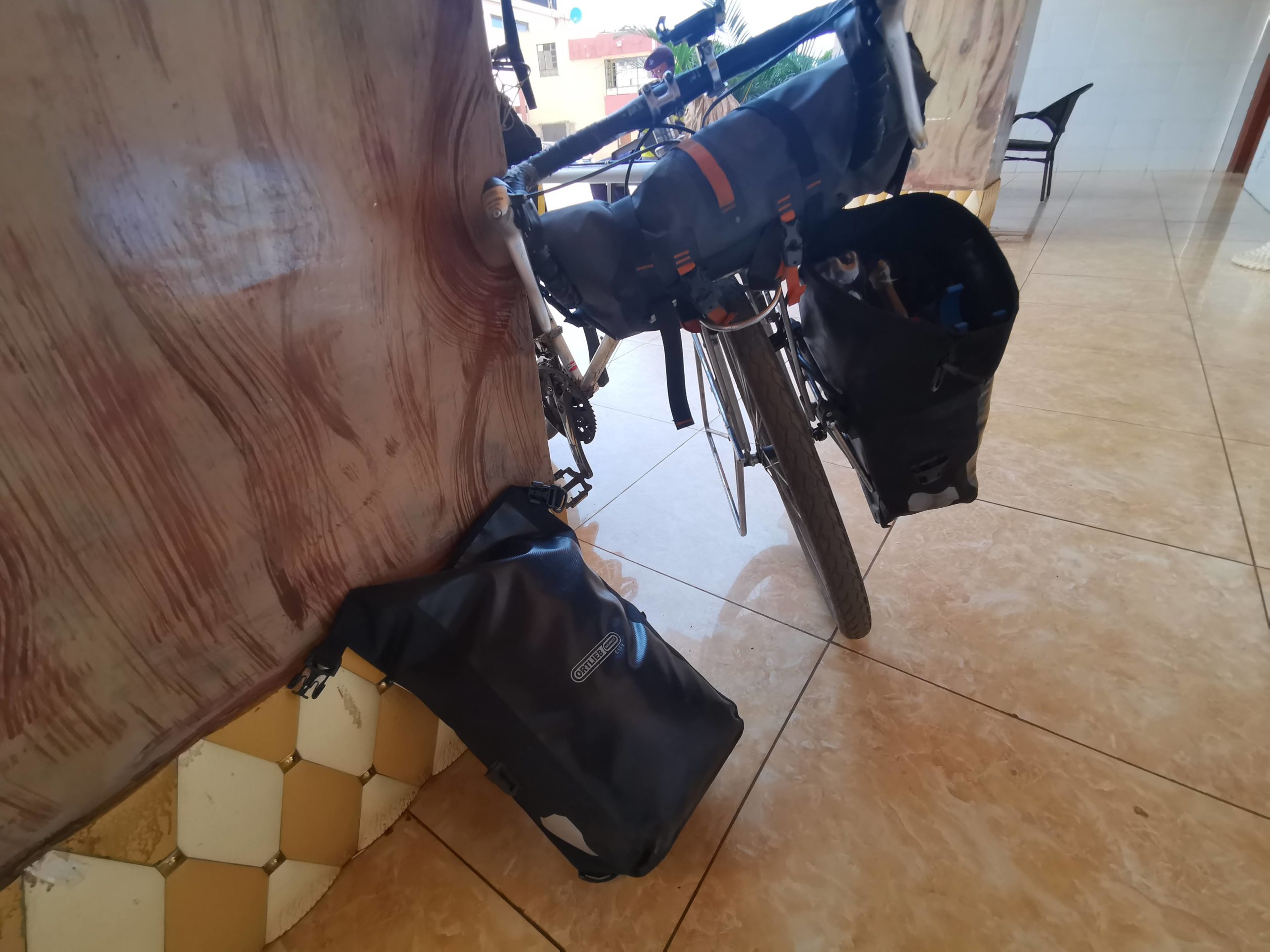 昨晩泊まっていた宿から走り始めてすぐ、近くにあった売店で水を購入しようとした。僕は店内から見える位置に自転車を壁に立てかけて、掘っ立て小屋のようなお店に入り、店主に水のお金を払っていた。店主がおつりを返そうとする間も、僕は後ろを振り返って自転車を見たりして警戒していた。数秒後に店主からおつりを受け取った僕は再び自転車を見た。…すると自転車に付いているはずの鞄が無くなっていたのだ。
