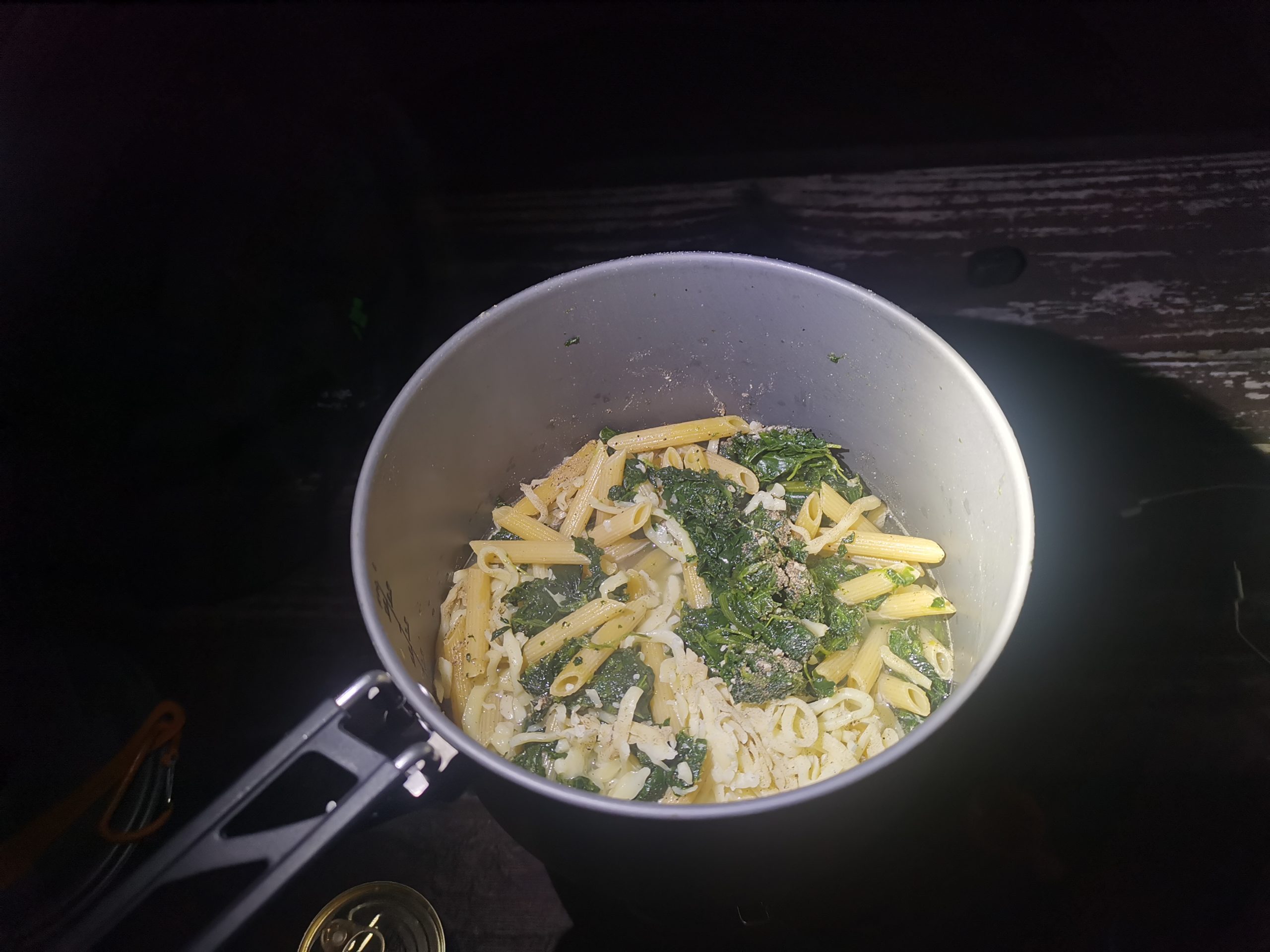 今日はシーチキンとほうれん草のパスタ。味付けは塩と胡椒とチーズ。寒さに凍えながら食べた。